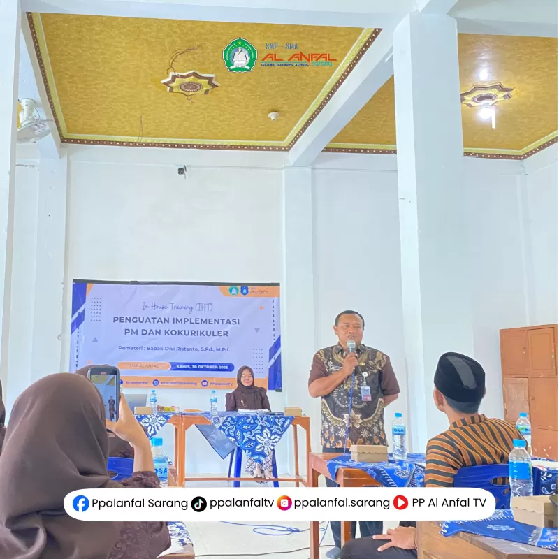 SARANG - Dalam upaya berkelanjutan untuk meningkatkan kompetensi tenaga pendidik dan kependidikan, SMA Al Anfal menyelenggarakan kegiatan In House Training (IHT) yang dilaksanakan pada Kamis, 30 Oktober 2025. Kegiatan ini mengusung tema "Penguatan Implementasi Pembelajaran Mendalam dan Kokurikuler".